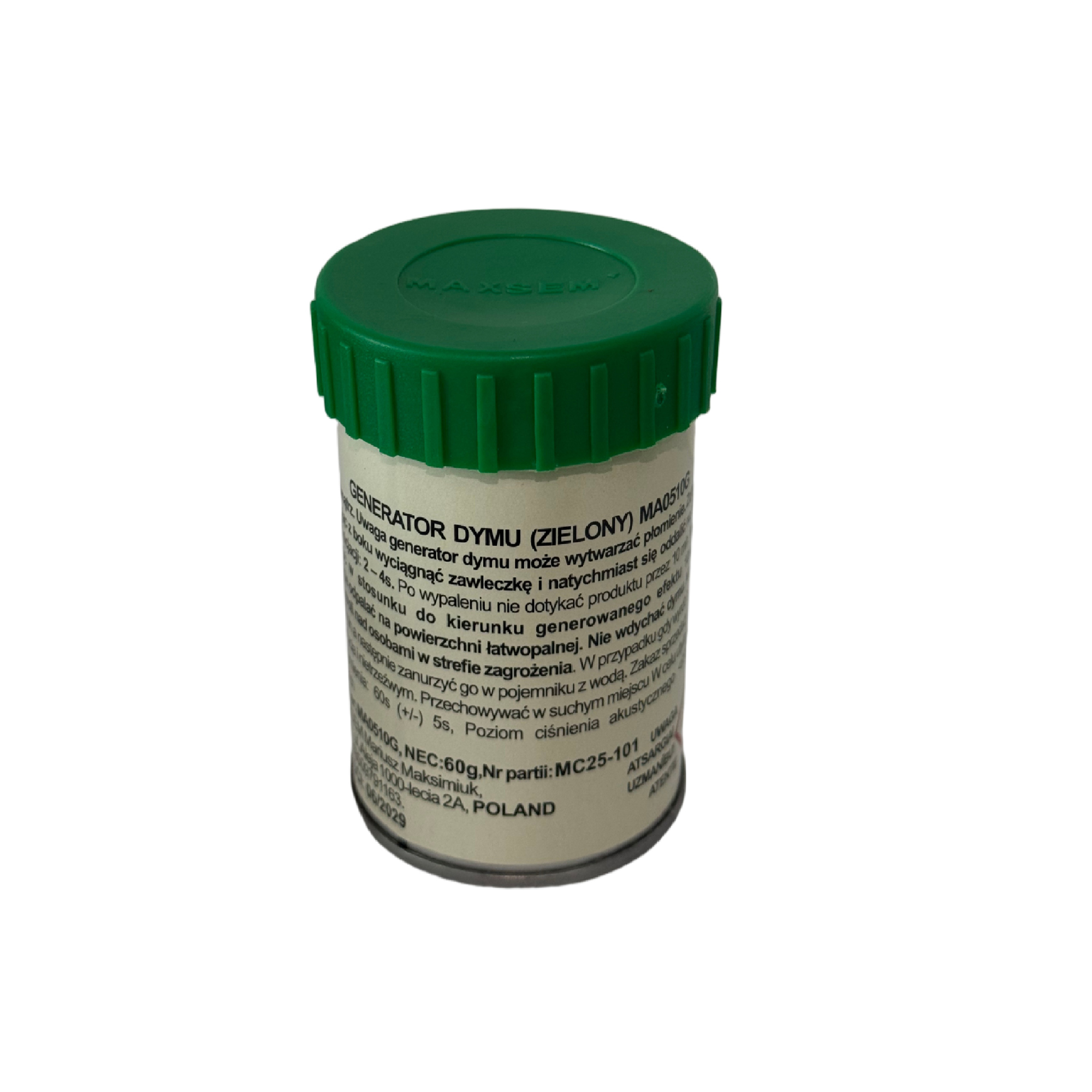 Granat Dymny Zielony MAXSEM MA0510G – gęsty dym, mocny efekt i szybkie odpalanie na zawleczkę. To nowość 2025 roku w metalowej puszce. Idealny do gier, zdjęć, filmów i pozoracji.