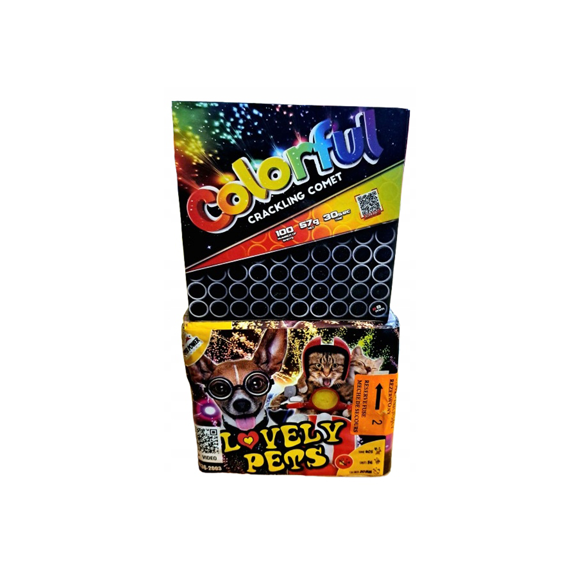 Kolorowy komplet fajerwerków to zestaw dwóch baterii fajerwerków z łączną liczbą 136 strzałów w kalibrach 8 i 20 mm. Idealny na imprezy, daje wiele barwnych efektów przy ograniczonym hałasie. Certyfikat CE, kategoria F2, czas 70 sekund.