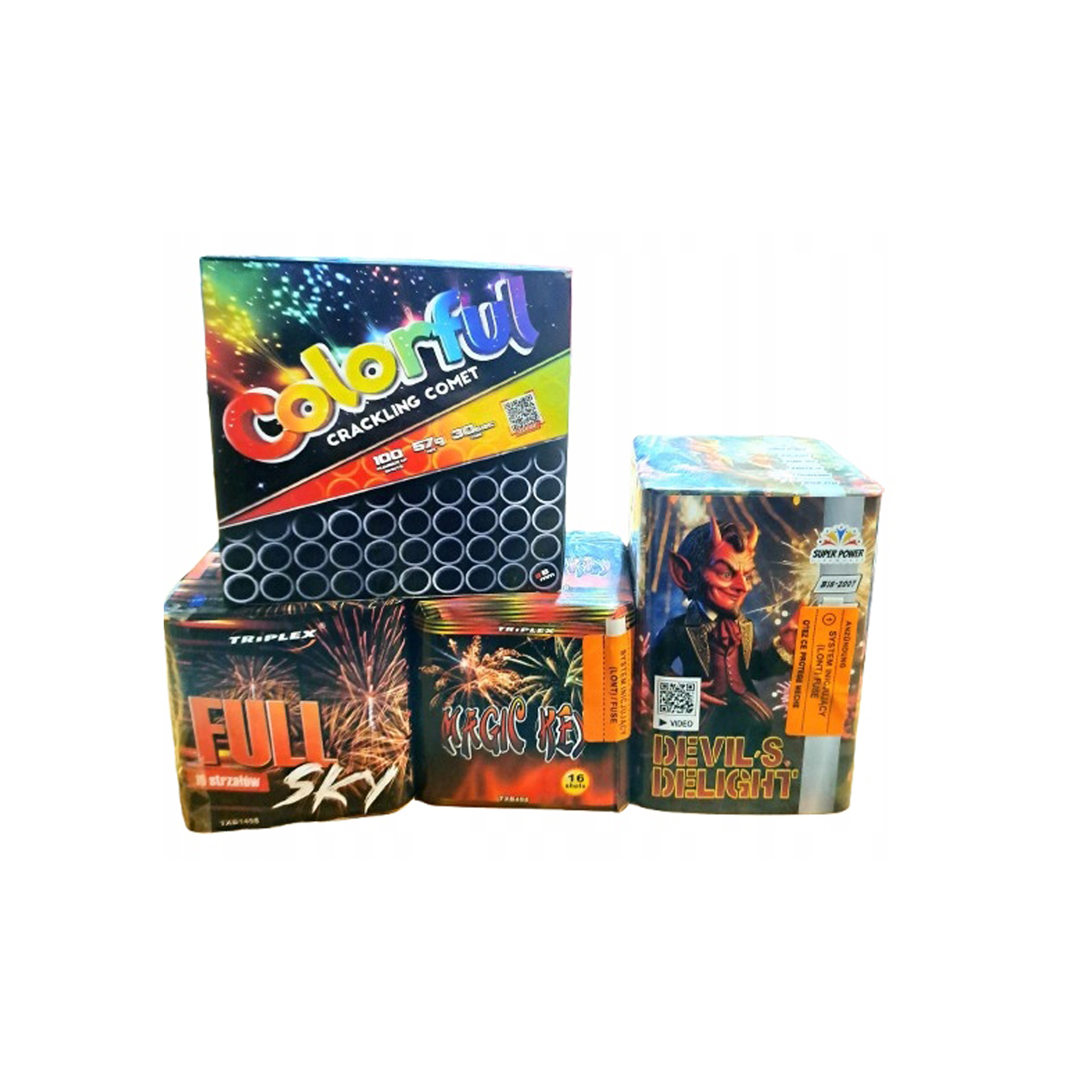 Specjalnie przygotowane efekty świetlne i kolorowe komety trzeszczące gwarantują widowiskowe doznania wizualne, a czas trwania spektaklu wynosi około 90 sekund, co pozwala w pełni cieszyć się pokazem. Baterie wchodzące w skład zestawu to: TXB1498, TXB498, B16-2007 i C1008CC. Dodatkowo, producent udostępnia film prezentujący efekty – wystarczy wpisać kody poszczególnych baterii w przeglądarce.